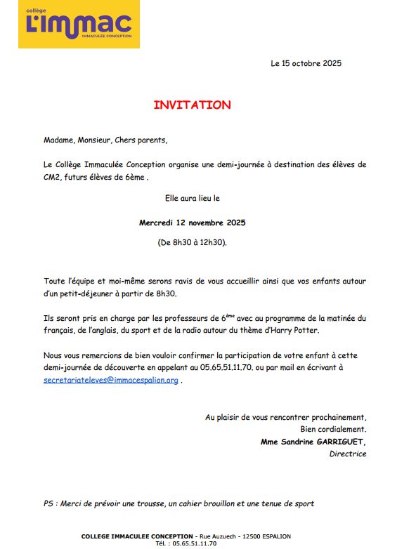 Le collège Immaculée Conception organise une demi-journée à destination des élèves de CM2, futurs élèves de 6ème. Toute l'équipe du collège sera ravie de vous accueillir !